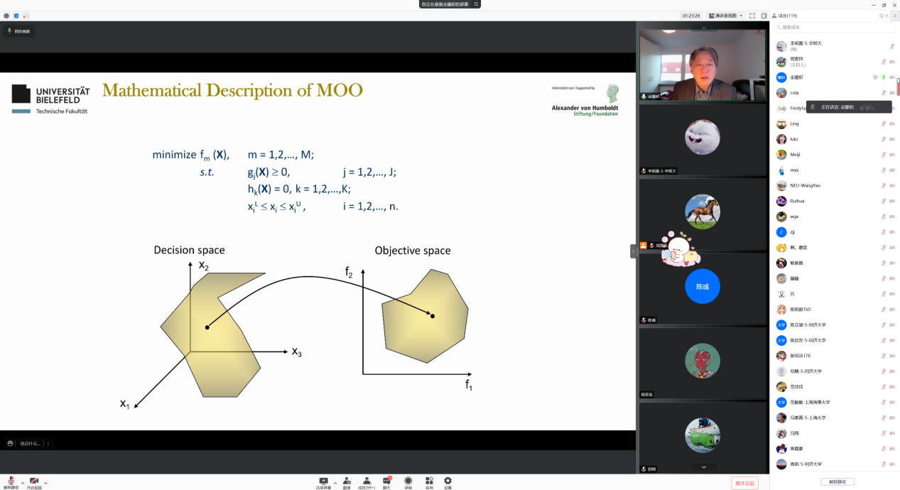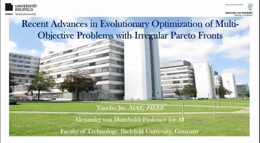 本次活动邀请到了来自德国比勒费尔德大学的金耀初教授作题为“Recent Advances in Evolutionary Optimization of Multi-objective Problems with Irregular Pareto Fronts”的专题报告。金耀初教授是德国联邦教育与研究部门认定的“Alexander von Humboldt教授”,同时也是英国萨里大学计算机系的“杰出讲席教授”,东北大学“长江杰出访问学者”,澳大利亚悉尼科技大学“杰出访问学者”,长期从事演化优化、演化学习、可信机器学习、演化发育系统等领域的研究。