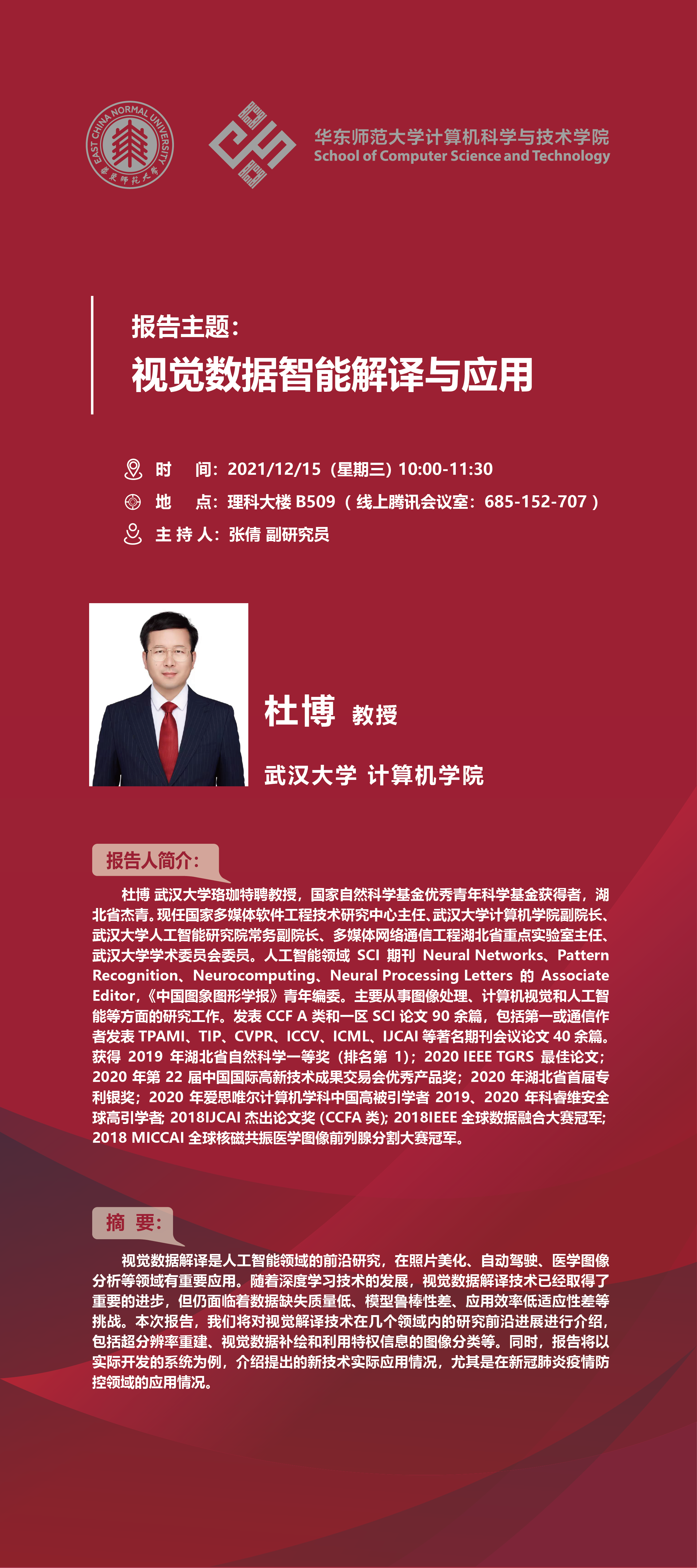 杜博,武汉大学珞珈特聘教授,国家自然科学基金优秀青年科学基金获得者,湖北省杰青。现任国家多媒体软件工程技术研究中心主任、武汉大学澳门六合彩官方 副院长、武汉大学人工智能研究院常务副院长、多媒体网络通信工程湖北省重点实验室主任、武汉大学学术委员会委员。人工智能领域SCI期刊Neural Networks、Pattern Recognition、Neurocomputing、Neural Processing Letters的Associate Editor,《中国图象图形学报》青年编委。主要从事图像处理、计算机视觉和人工智能等方面的研究工作。发表CCF A类和一区SCI论文90余篇,包括第一或通信作者发表TPAMI、TIP、CVPR、ICCV、ICML、IJCAI等著名期刊会议论文40余篇。获得2019年湖北省自然科学一等奖(排名第1);2020 IEEE TGRS最佳论文;2020年第22届中国国际高新技术成果交易会优秀产品奖;2020年湖北省首届专利银奖;2020年爱思唯尔计算机学科中国高被引学者2019、2020年科睿维安全球高引学者;2018IJCAI杰出论文奖(CCFA类);2018IEEE全球数据融合大赛冠军;2018 MICCAI全球核磁共振医学图像前列腺分割大赛冠军。