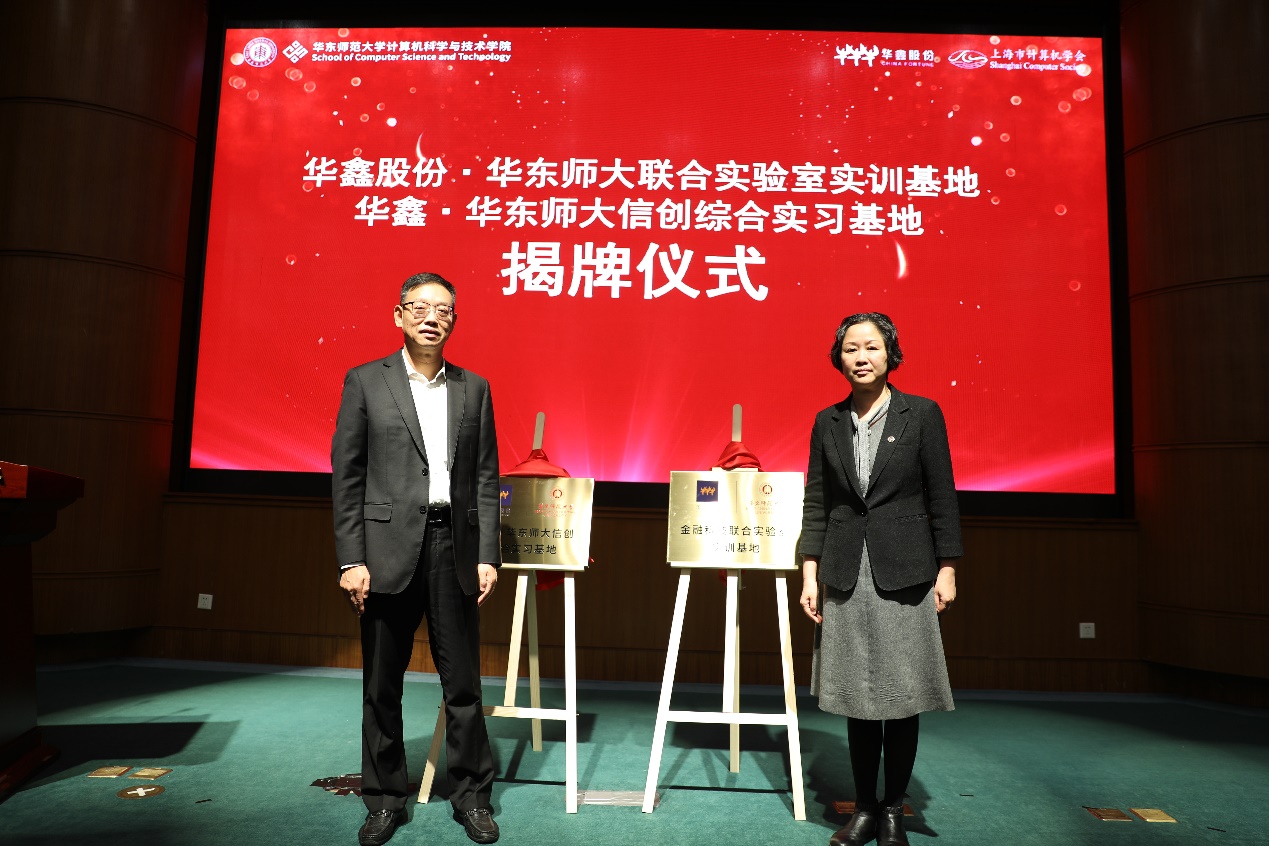 在热烈的掌声中,华东师范大学副校长程静与上海华鑫股份有限公司党委书记沈巍共同移步台前,为联合实验室实训基地与信创综合实习基地揭牌。仪式现场,大红绸缎缓缓飘落,崭新的牌匾在灯光下熠熠生辉,象征着华东师范大学与华鑫股份深度携手、协同共进。