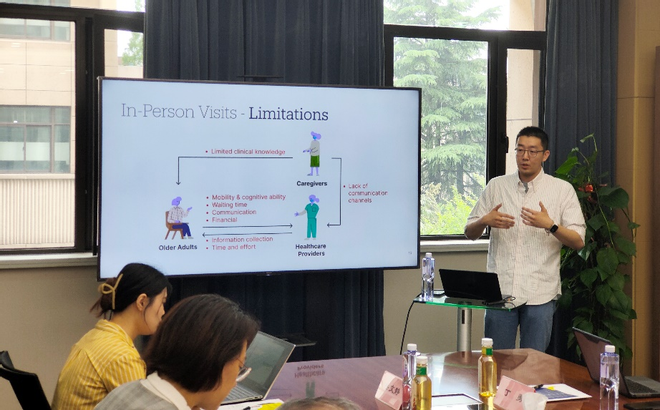在嘉宾报告环节,姚炳盛博士以“To Facilitate Older Adults' Better Aging-In-Place: Large Language Models for Remote Well-Being Management”为主题,分享了其团队所开展的基于大语言模型的远程健康管理系统构建与应用研究。该系统针对居家老人、病人的健康照护需求,及其专业知识背景有限的特征,利用大语言模型更流畅、自然、智能的引导对话和需求挖掘能力,设计了面向居家健康的引导式对话交互模型,并围绕多元利益相关者的需求进行了对话内容分析和可视化设计,以更好地满足居家健康照护场景下多元利益相关者的健康需求。