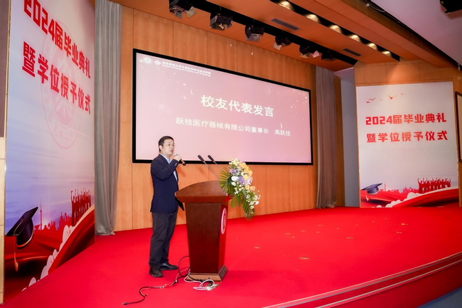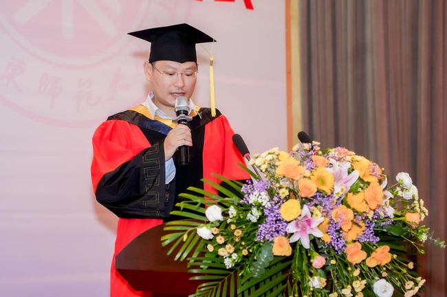 校友代表高跃技带来他的励志故事,并送上毕业祝福。他回忆起自己的大学时光以及毕业后的工作经历,鼓励毕业生们要坚定信心,面对纷繁芜杂的社会现实,要不畏失败,勇于挑战,要珍惜爱情、家庭与健康。