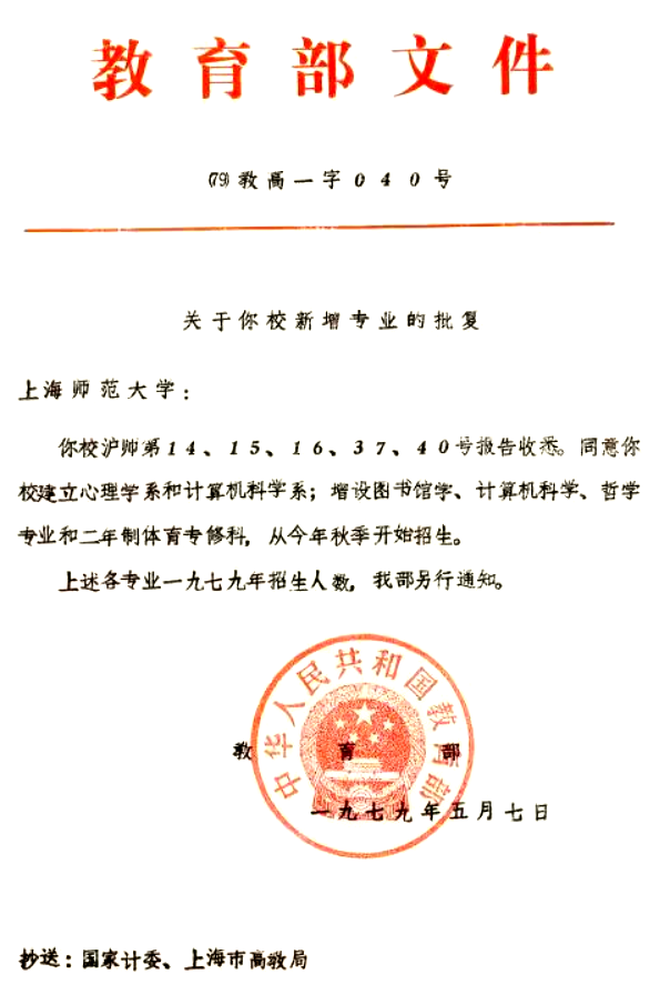 当时数学系的老师们造出了可以运行ALGOL 60程序设计语言的725数字电子计算机;华东师范大学数学系、物理系和校办工厂的老师们还参加了电子工业部100系列和200系列数字电子计算机的联合设计组工作。学校的校办工厂成为国内第一批能造出国家联合设计的DJS-100系列电子计算机的单位;但实际上华东师范大学在计算机科学技术领域确实没有权威人士,也缺乏专业教师。当时参加国家系列计算机研制和承担电子工业部项目的老师们职称最高的只是讲师,但他们就是以敢为人先的拼搏精神、不屈不挠的顽强毅力、一丝不苟的科学态度获得了同行们的认可和有关政府部门的信任。现在很难想象那时我们的科研团队只用获得的3万元项目经费在国产DJS-130小型电子计算机系统上用汇编语言完成了一个6000多人大厂的企业管理系统。当时的电子工业部为了奖励参加项目研发的老师们,给科研组发放了高于科研项目经费3倍多的奖金;在计算机外部设备的研究领域,华东师范大学的老师们也是攻坚克难、捷报频传;正是在这样的大好情况下,当时华东师范大学的领导抓住了学校出现的良好苗子,当机立断,做出了“向教育部申请成立计算机科学系”的决定并请陶增乐、吕传兴老师等筹划向教育部申报新专业的具体事宜。一所师范大学,在上世纪70年代,要办计算机科学专业,在当时无论是师资力量和实验设备等方面都有很大的困难,但华东师范大学却凭借着前期积累的实力,下决心要申办这个属于前沿学科的专业。在学校领导和有关院系的努力下,1979年5月7日,教育部发文批准了华东师范大学关于成立计算机系的申请并同意于当年开始招生,学生毕业后可授予工学士学位(图1)。