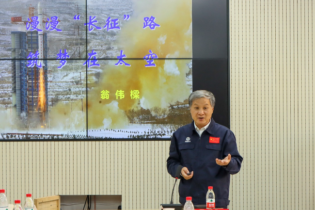 翁伟樑为全体师生讲授了《漫漫“长征”路,筑梦在太空》主题党课。结合自身工作和奋斗经历,阐述了中国航天“三大精神”——航天传统精神、载人航天精神和“两弹一星”精神的内涵与实质。党课在其朗诵自撰短诗《难说再见——致长四队伍的兄弟姐妹》和经久不息的掌声中结束。
