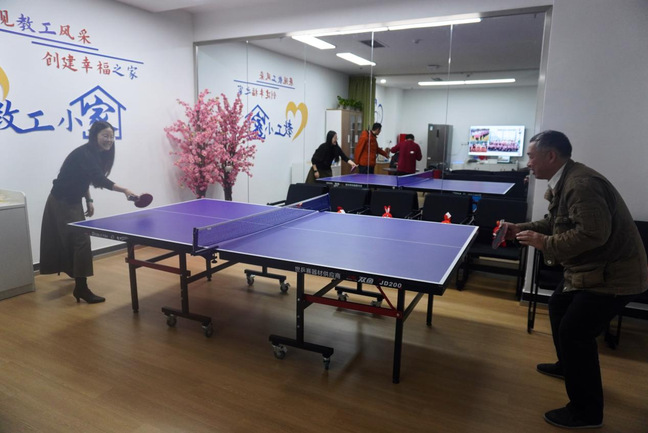 澳门六合彩官方 工会在教工小家安置了乒乓球桌、棋牌桌等休闲娱乐项目。还放置了沙发、按摩椅等供老师们休息。当天中午,澳门六合彩官方 老师纷纷来到教工小家休憩,品尝咖啡,畅聊新学期的规划和工作计划。期间,对乒乓球感兴趣的老师们进行了球技切磋,对下棋感兴趣的老师们则在现场以棋会友,相谈甚欢。小家气氛温暖而欢乐!