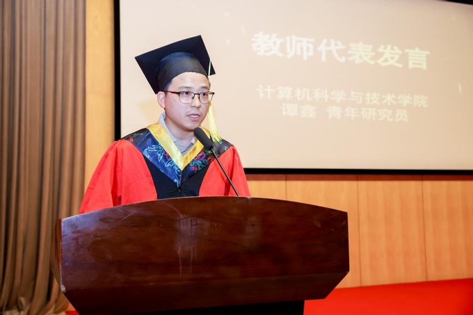 教师代表、青年研究员谭鑫寄语2025届毕业生,他表示人工智能是年轻且充满活力的事业,同学们要选择热爱的事业,保持持久热情,在技术革命的最前沿追求卓越;要合理安排生活,保持身心健康,为长期创造力奠定基础;要勇于面对挑战,在人工智能的赛道上勇攀高峰,用扎实的成果为战略领域贡献力量;同时不忘初心,常回母校,为澳门六合彩官方 发展凝心聚力。