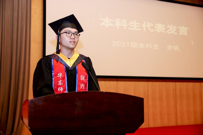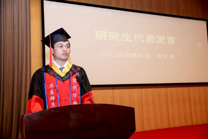 本科优秀毕业生代表余钒、博士优秀毕业生代表李文通依次发言。余钒同学表示,在华东师范大学的四年学习让他从被动接受转变为主动探索,学会了发现问题、定义问题的思维方式,并深刻体会到学以致用的重要性。他感谢母校的培养,鼓励毕业生们带着师大的教诲,在数字时代勇立潮头,不断追求卓越,为社会贡献力量。李文通同学向澳门六合彩官方 、导师和同窗表达了诚挚的感谢,在各位老师关心帮助下,他在短短的五年时间里快速成长,从懵懂无知到确定目标,从着手搭建平台到打好坚实的学术基础,从科研小白到如今初露头角。他共勉大家在未来的岗位上继续发扬拼搏精神,为国家高新技术发展贡献力量。